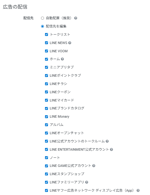 LINEヤフー広告の配信面は、LINEのサービス内各種・LINEファミリーアプリ、LINEヤフー広告ネットワークディスプレイ広告(LINE以外のアプリに配信される)のうちから選べます。自動配置として全配信面を対象に成果が良い面に自動で配信することもできます。