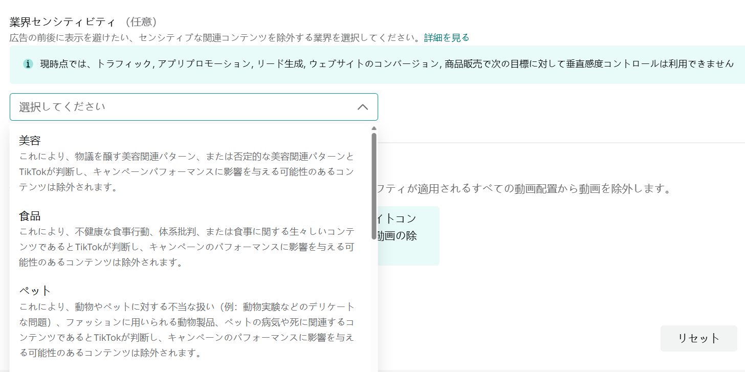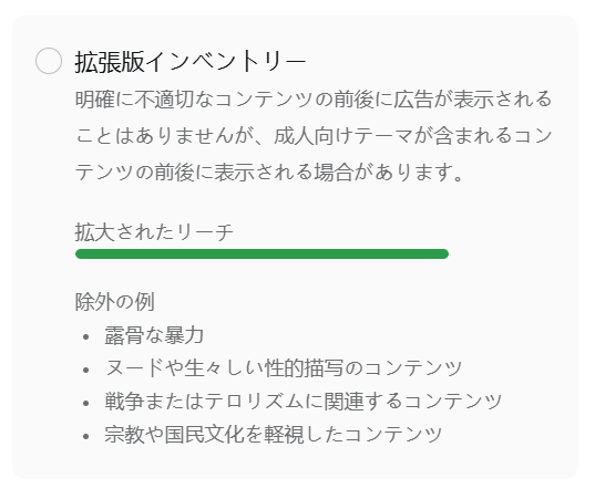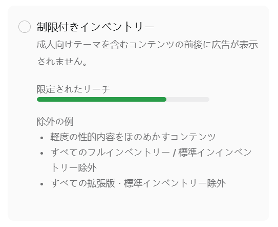 制限付き:厳格な基準が必要なブランド向け。ミュージックビデオ等も対象外になる場合あり