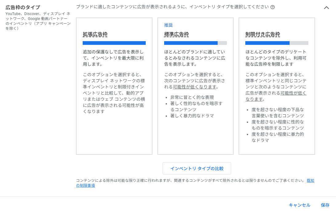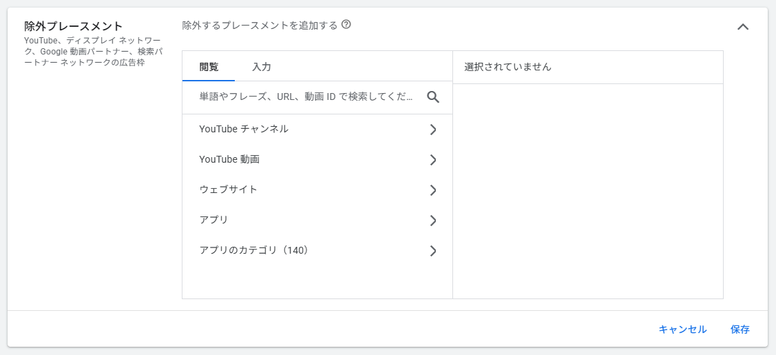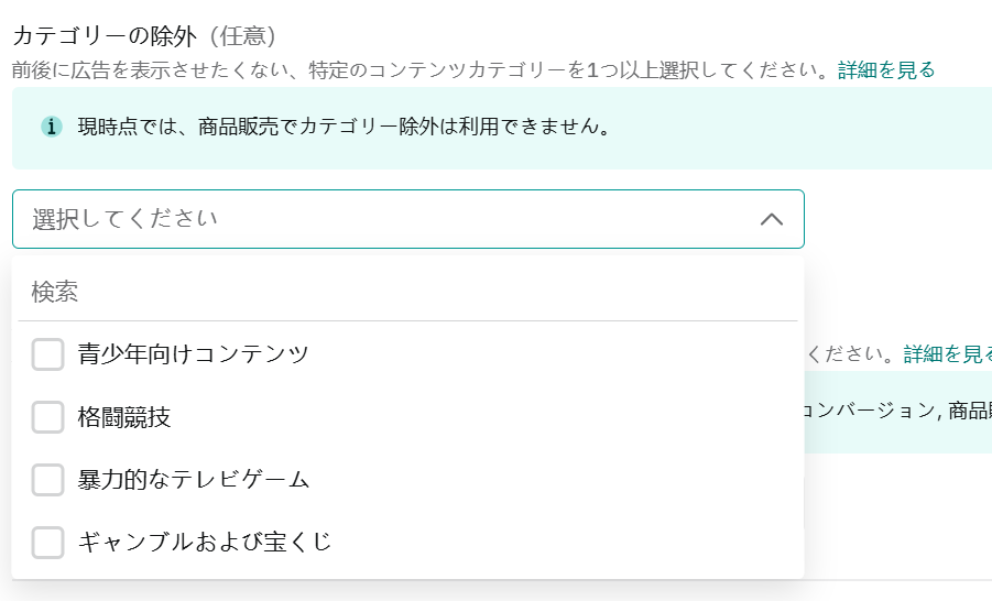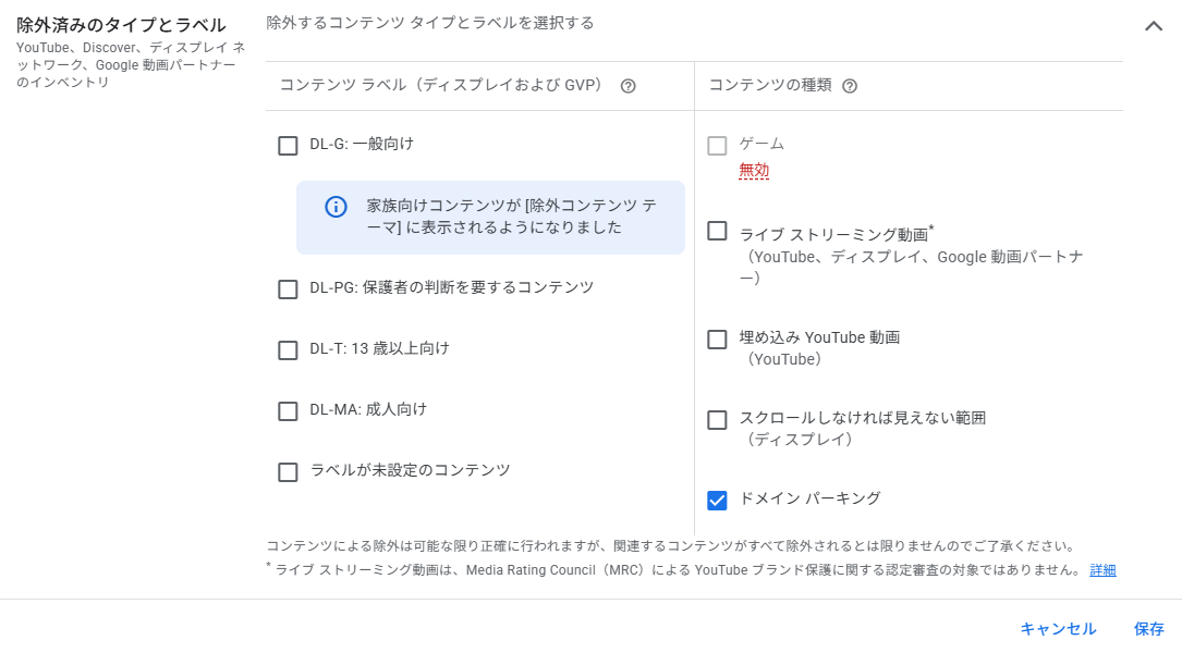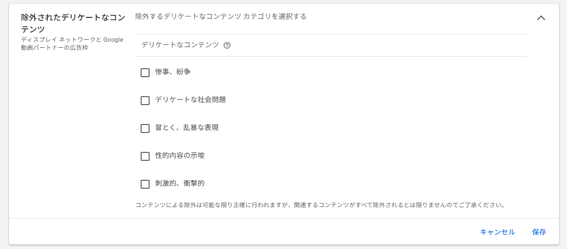 デリケートと見なされるカテゴリのコンテンツに広告を表示しないよう設定できます。ただし動画キャンペーン(YouTube広告)には適用されません。