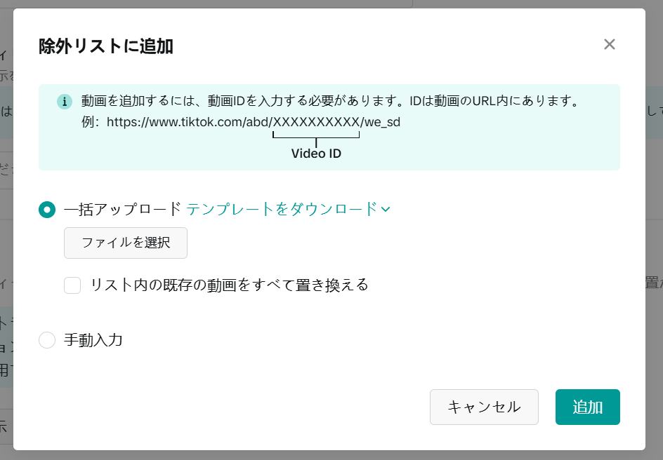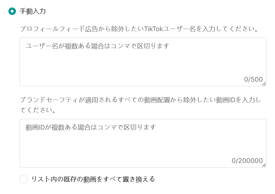 特定のプロフィールをプロフィールフィード広告から除外します。除外したいユーザー名と動画IDを手動で登録できるほか、CSVファイルで一括登録もできます。