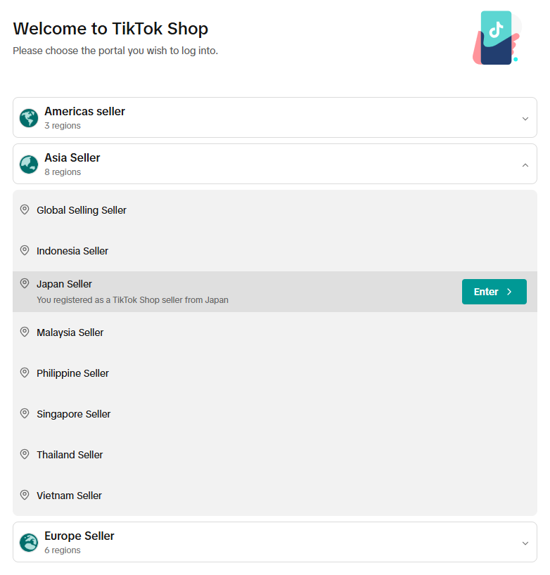 TikTokショッピング広告を始めるには、まずTikTokAdsManagerでの設定が必要です。TikTokShopの販売者アカウント(Seller)を事前に作成しておきましょう。こちらの作成ページで国を選んで登録します。