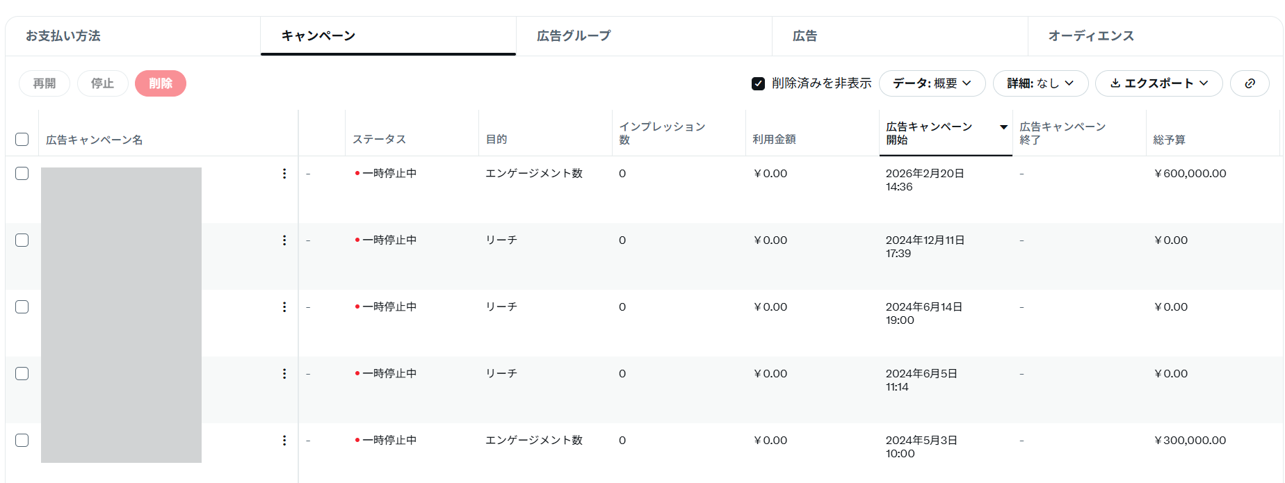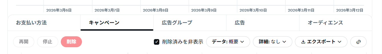 キャンペーン画面は、X広告を入稿・運用する際に最もよく使う画面です。ここでは主に以下のような操作をします。