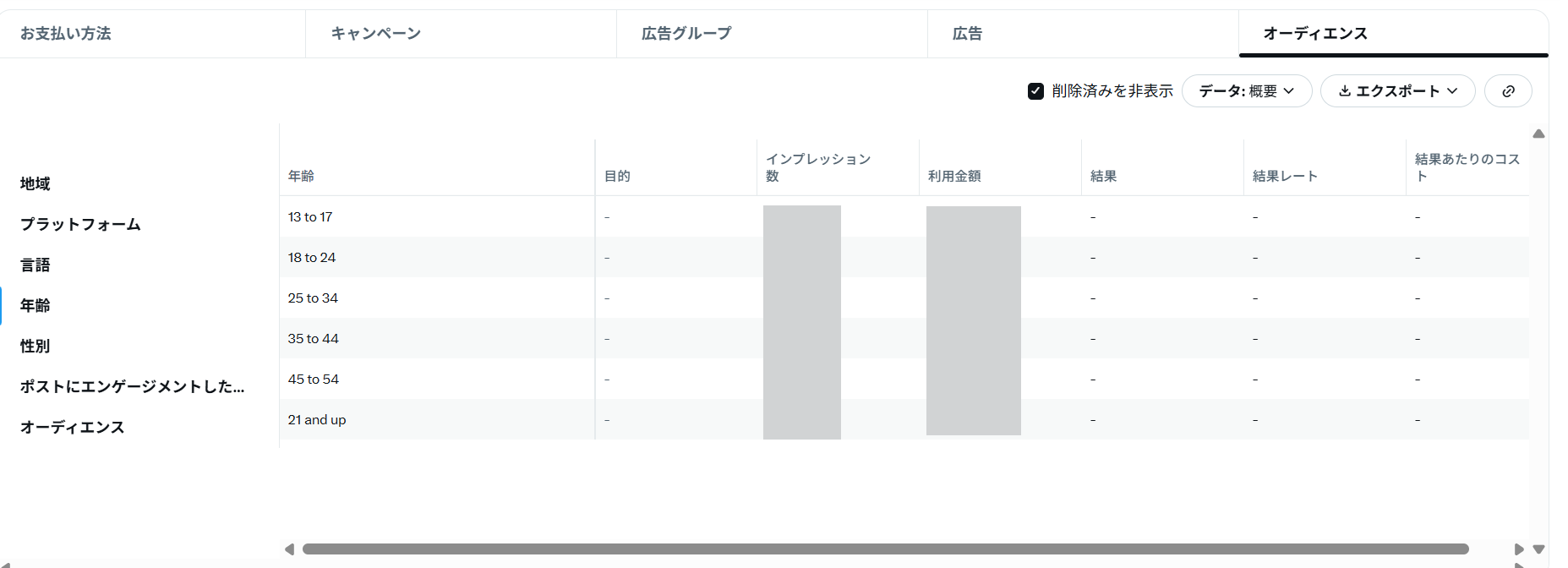 費用、インプレッション、エンゲージメント数、クリック数、コンバージョン数などの主要指標を確認できます。