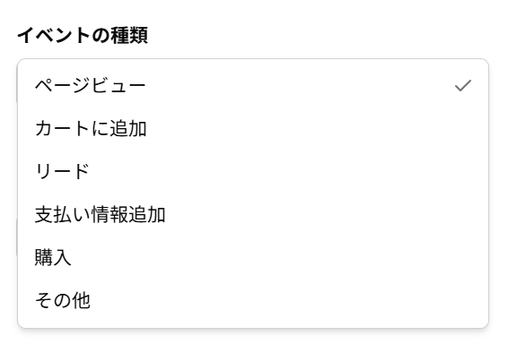 X広告では、サイトやアプリ上で発生するさまざまなユーザー行動をイベントとして設定できます。計測できるのは「ページビュー・カートに追加・リード・支払い情報追加・購入・その他」です。