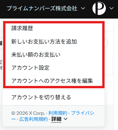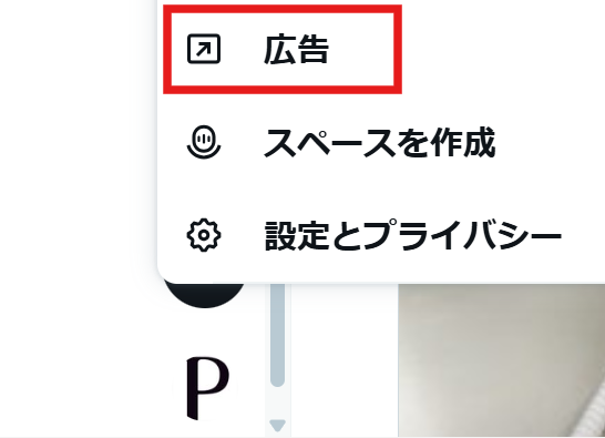 X広告の管理画面には、Xアカウントのアイコン上部メニュー>「広告」からアクセスできます。
