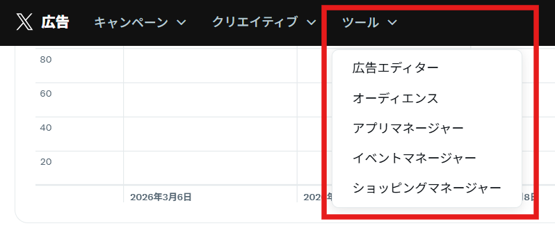 X広告では主に次の方法でコンバージョンを計測します。管理画面上部の「ツール」>「イベントマネージャー」で
