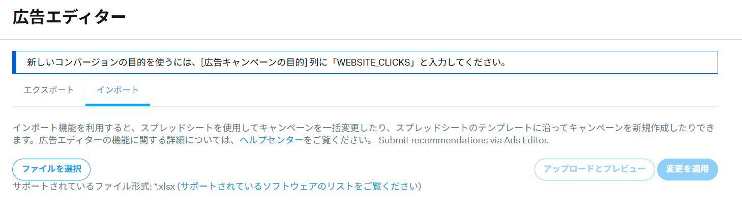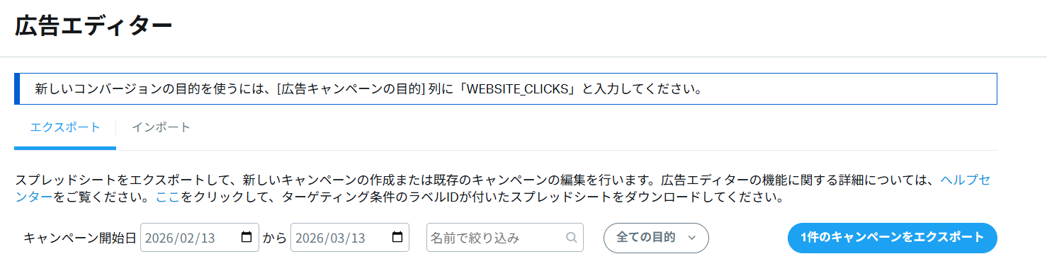 キャンペーン・広告グループ・広告の設定をExcel形式のファイルで一括管理・編集できる機能です。広告データを表形式でエクスポートして修正し、再度アップロードすることで変更を一括で反映できます。これにより、予算やターゲティング、広告文などを複数の広告で同時に更新したり、大量の広告を効率的に入稿したりすることができるようになります。大量の広告を運用する際やABテストを行う際に効率よく作業できます。