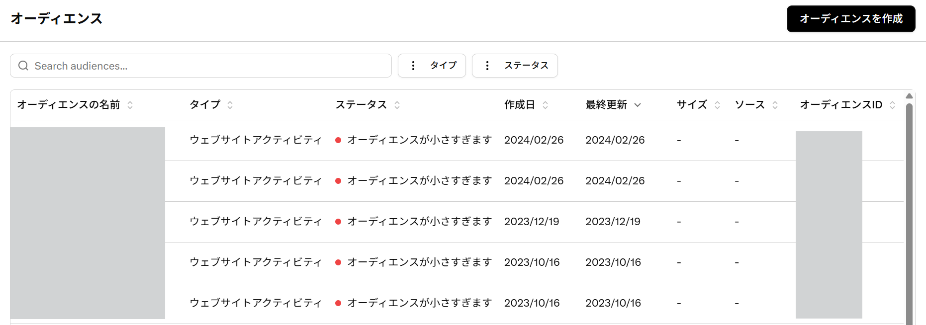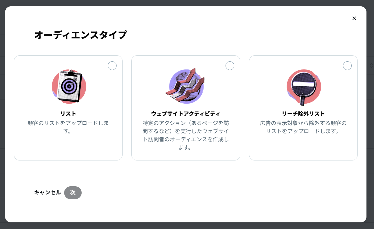 作成できるオーディエンスタイプは「リスト」「ウェブサイトアクティビティ」「リーチ除外リスト