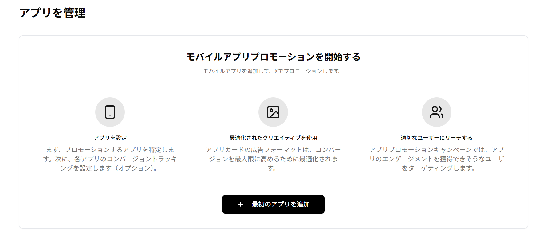 広告アカウントに自社のモバイルアプリを登録・連携するための機能です。アプリを追加すると、アプリのインストールやアプリ内行動を計測できるようになり、アプリインストール広告やアプリエンゲージメント広告の配信が可能になります。また、計測ツール(MMP)と連携すると、インストール数やアプリ内イベントを広告の成果として分析・最適化できます。