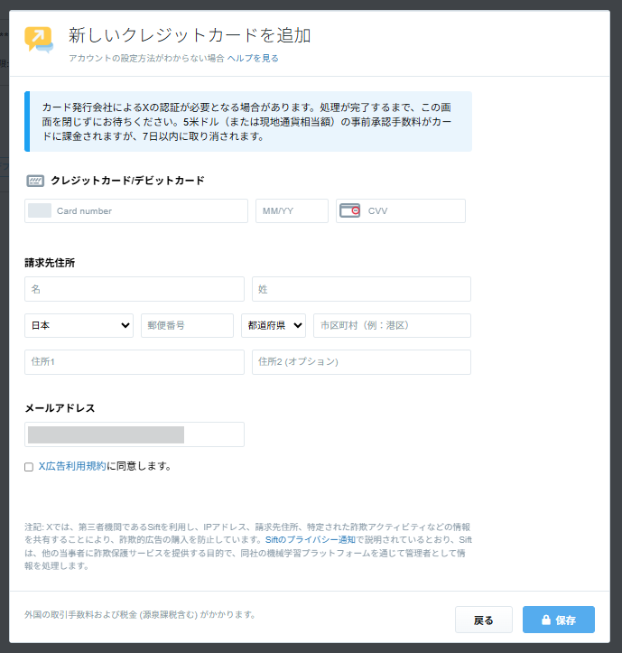 X広告のセルフサーブ(自己管理型)アカウントでは、クレジットカードまたはデビットカードで支払いを行います。対応しているカードブランドは、Visa、Mastercard、American Express、Discover、JCB(日本円・米ドルのみ)などです。「Add new funding source」から新しいカードを追加します(参照:X公式ヘルプ「Billing basics」)。