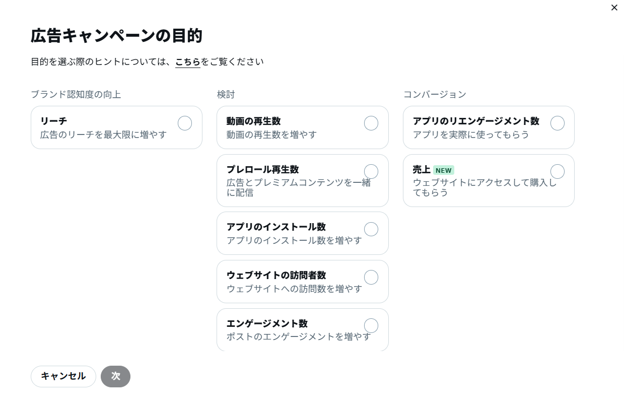 まず、キャンペーンの目的を選択します。X広告では、目的ごとに最適化no