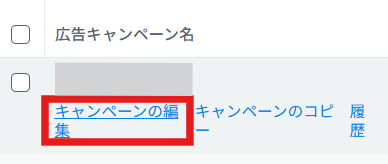 「キャンペーンの編集」をクリックすると、キャンペーンの詳細設定画面に入ります。ここでは、予算上限の変更や配信期間の変更ができます。「履歴」からはキャンペーンの編集履歴が確認できます。