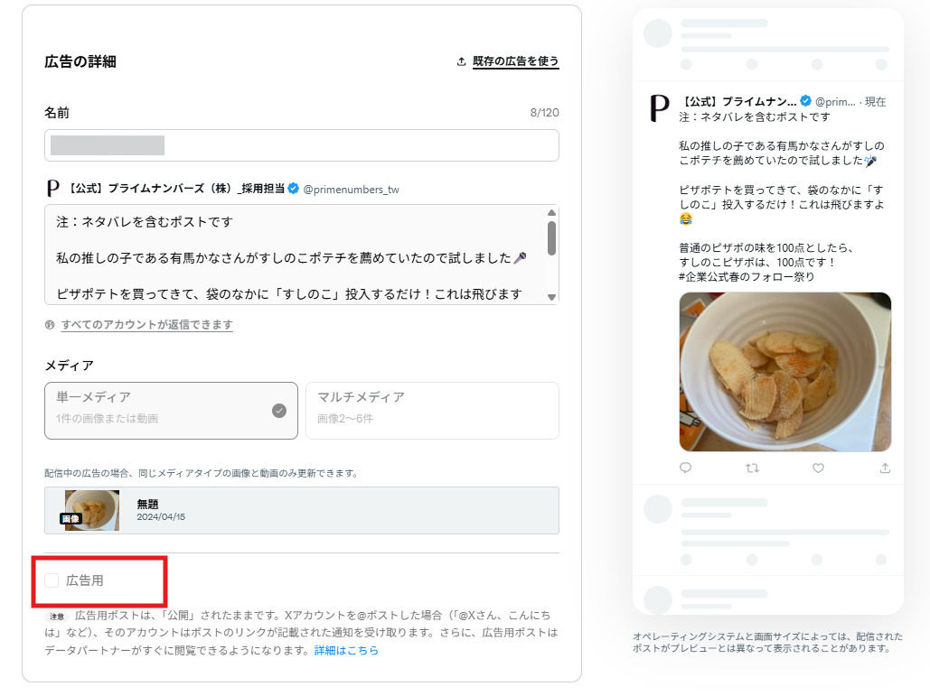 赤枠「広告用」にチェックを入れると、ポストは広告用として入稿されます。また上部の「既存の広告を使う」を開くと、すでに投稿されているポストや入稿済みの広告用ポストを選択して配信できます。