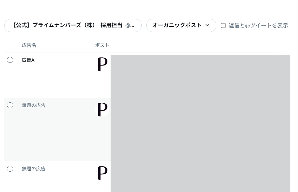広告に使用するポスト(プロモーテッド広告)の作成・管理を行う画面です。プロモーテッド専用ポストもここから作成できます。