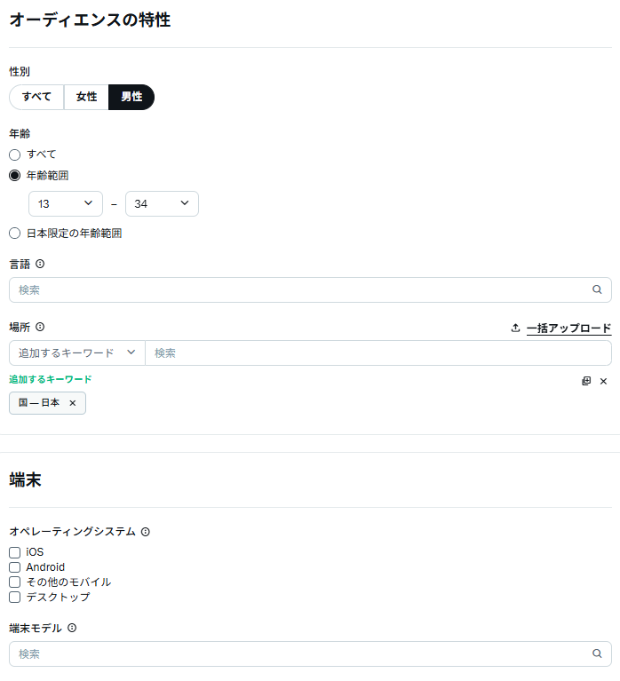 | 性別 | 「すべて」「男性」「女性」から選択 | ターゲットを絞りすぎない「すべて」が初期設定の推奨 |