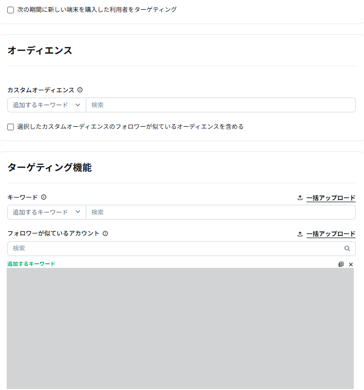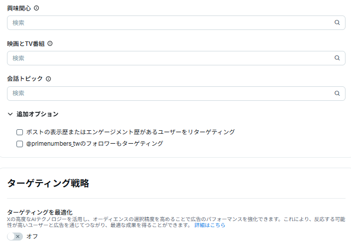 | フォロワー類似 | 特定のアカウント(競合や関連メディア等)のフォロワーと「似た興味を持つ」ユーザーを狙う | 自社と親和性の高い層を効率よく見つける、X広告で最も人気のある手法 |