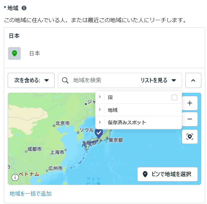 国、都道府県、市区町村はもちろん、店舗周辺の半径〇kmというより具体的な指定も可能です。実店舗への来店が前提のサービス(フィットネスジムや美容エステなど)や、商圏が限定されるビジネスで活用します。