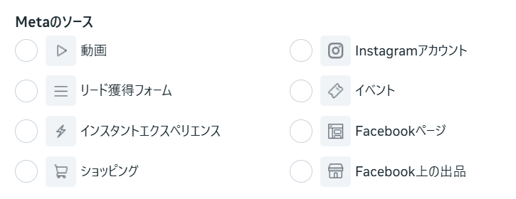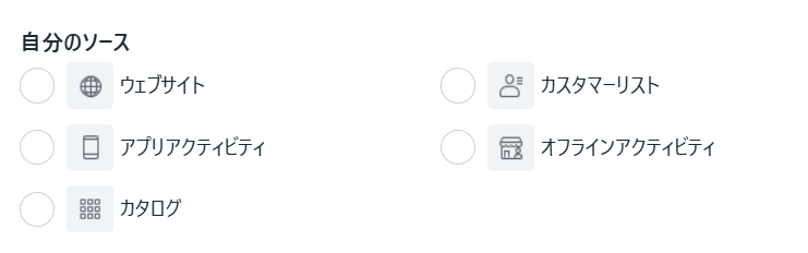 自社が保有している顧客のデータや、Metaプラットフォーム上でのユーザー行動履歴をもとに、特定のユーザーグループを作成してアプローチする機能です。リターゲティング広告の配信に活用します。「自社のソース」「Metaのソース」の2種を活用します。