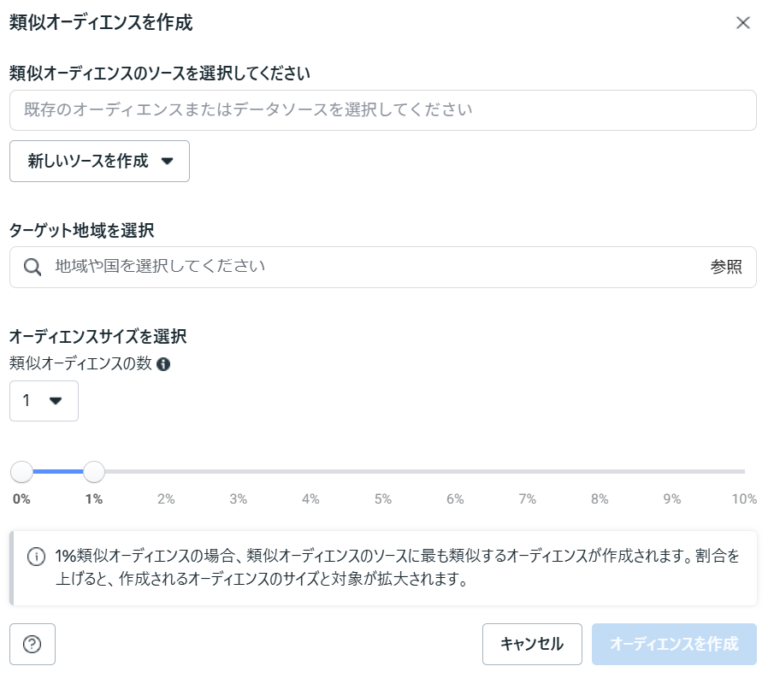 元となるソースオーディエンス(例:過去30日間の購入者リスト)を指定し、類似度を1%〜10%の範囲で設定します。1%が最も類似度が高いため、まずは1%から試して徐々に拡大することをおすすめします。