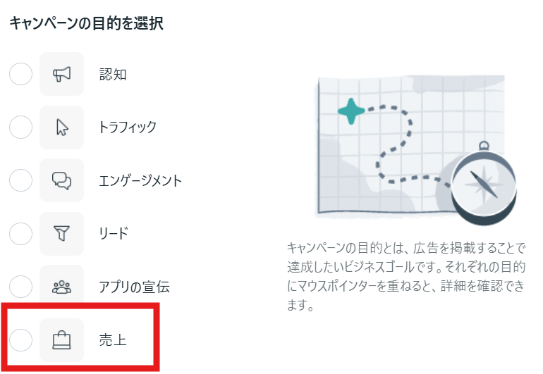 ②キャンペーンの目的で[売上]を選択し、[次へ]をクリックします。
