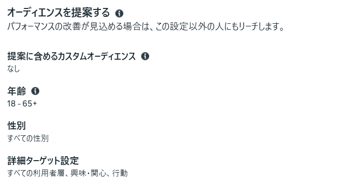 | オーディエンス | 基本的にはAIによって自動でターゲティングされるが、「提案」として年齢、性別、興味関心、利用者層、行動を指定可能 |