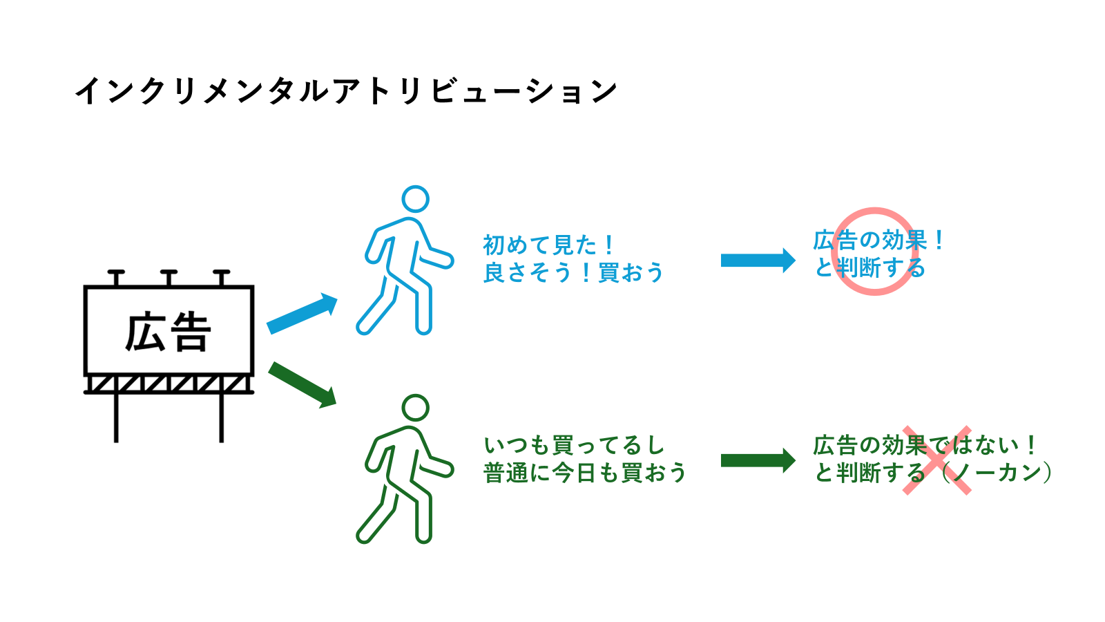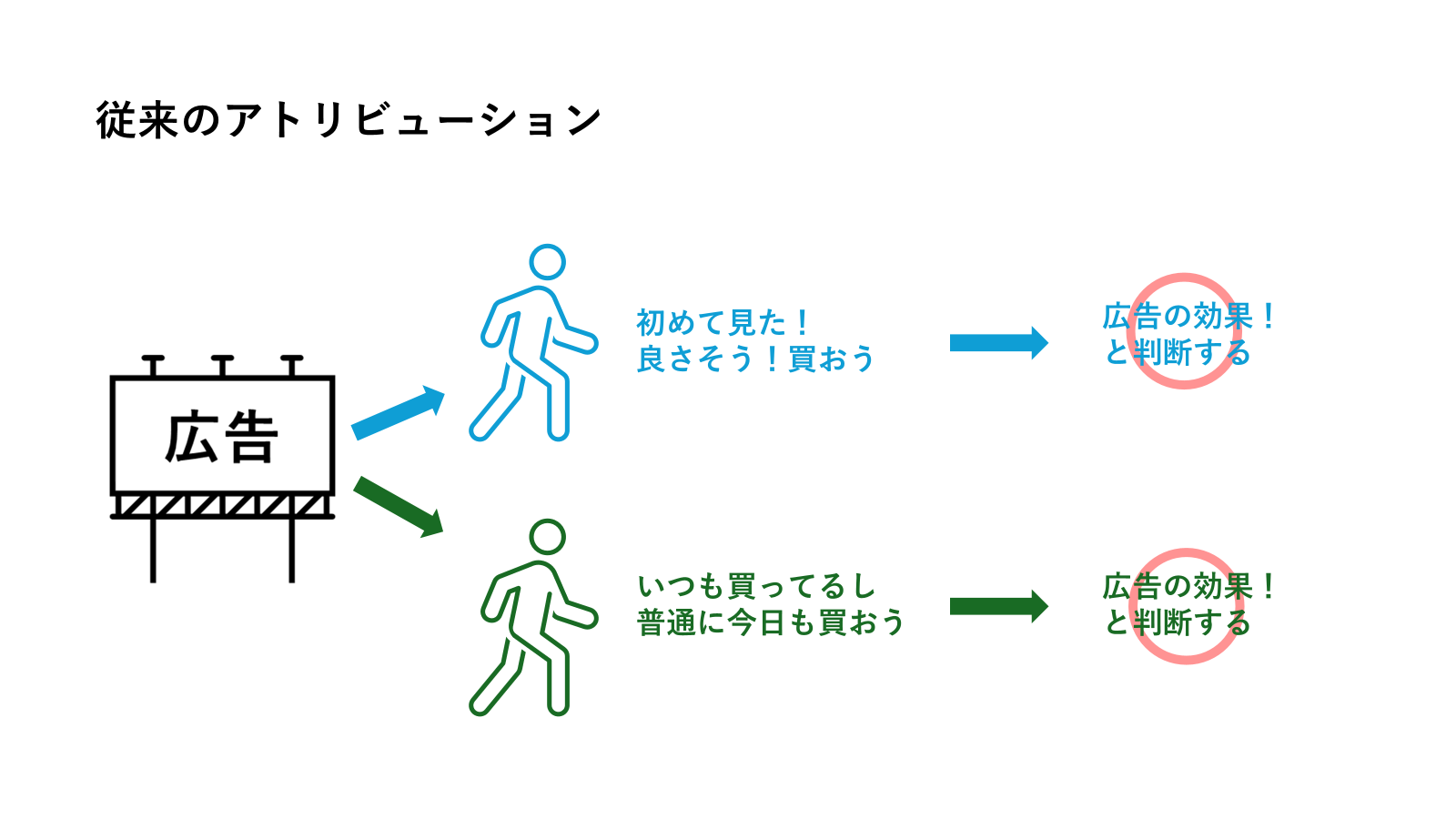 従来のアトリビューションは「広告を見てから商品を買った人」をすべて広告の効果としてカウントしますが、この場合いつもその商品を買っている(=広告を見なくても買っていたであろう)常連客も「広告の効果によって獲得した客」と計上されてしまいます。