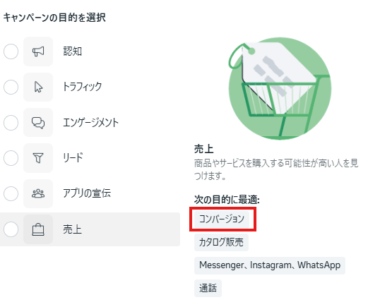 Meta広告マネージャにログインし、新規キャンペーンを作成します。キャンペーンの目的は「コンバージョン」や「売上」など、コンバージョン計測を行う目的を選択してください。目的を選択すると右側にさらに細かい目的が表示されるので、「コンバージョン」を含むものにすることをおすすめします。