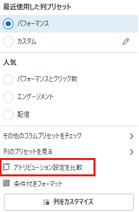 インクリメンタルアトリビューションの結果は、Meta広告マネージャの「アトリビューション設定を比較」機能で確認できます。
