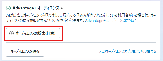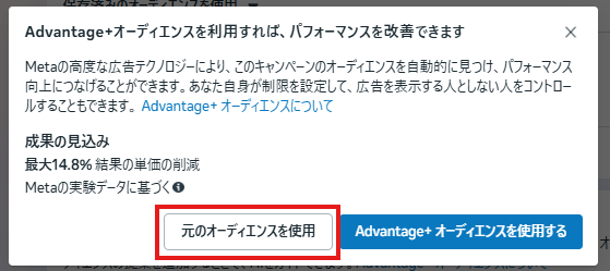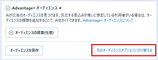 切り替えることはできるものの、媒体としてはAdvantage+オーディエンスの利用を強く推奨しているため、ポップアップや注意書きで繰り返し利用を促されます。代理店担当者としても、「特定の層以外には絶対に出したくない」という場合以外は利用を推奨します。