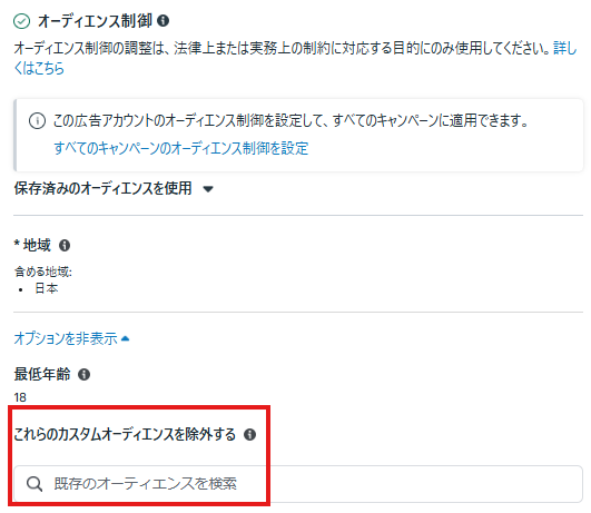 広告セットの入稿画面「オーディエンス制御(その他のオプション)」の欄から設定できます。除外したいユーザーは「カスタムオーディエンス」にまとめておく必要があります。