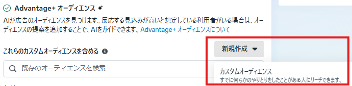 カスタムオーディエンスは既存のものを使えるほか、広告セットの入稿画面から新しく作成することもできます。