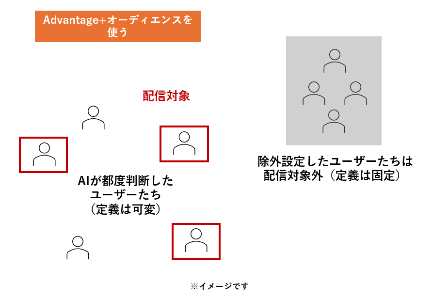 Meta広告には「広告に興味を持ちそうなユーザー」を自動でターゲティングする「Advantage+オーディエンス」という機能があります。優秀なAIにターゲットの選定を任せられるため成果が出やすく、媒体(Meta)も推奨しています。