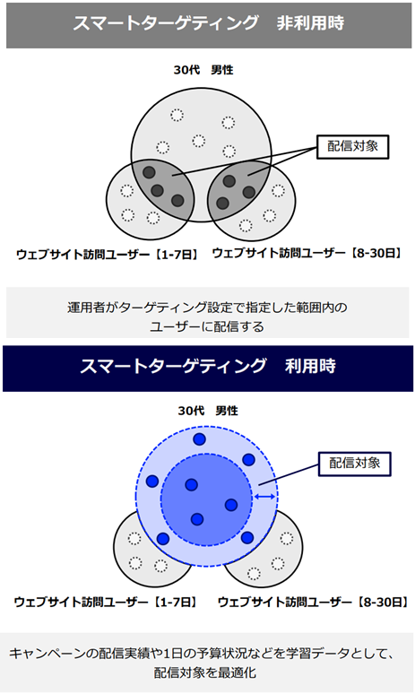 Yahoo!広告 ディスプレイ広告(運用型)のスマートターゲティングにおいて、学習に利用されるオーディエンスリストのデータ範囲が拡大され、ターゲティング精度が改善されました。これにより、システムがより多くのデータを基に学習を行い、広告配信の効果向上が期待できます。