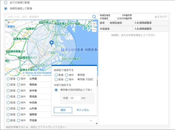 ・海上など、もともと広告が配信されないエリアは半径指定の範囲内に含まれていても広告は配信されません。