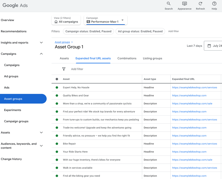 URL拡張機能によって自動生成されたテキストなどのアセットを確認できるレポートが追加され、意図しないアセットはレポート画面から削除が可能です。また、広告のパフォーマンスを向上させるために、AIが追加すべき画像の種類や既存の画像の改善方法などを提案する機能も利用できます。