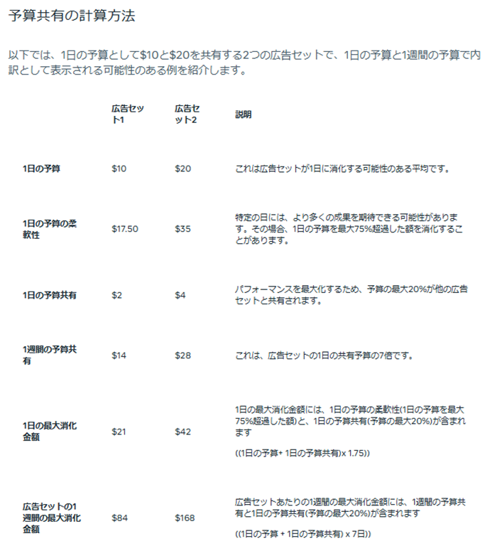 この機能が有効な場合、ある広告セットでより良い成果が見込めると、同じキャンペーン内の他の広告セットの日予算から最大20%分が自動的に再配分されます。これにより、特定の広告セットの成果が向上した際にシステムが自動で予算を上乗せするため、成果を最大化しやすくなります。