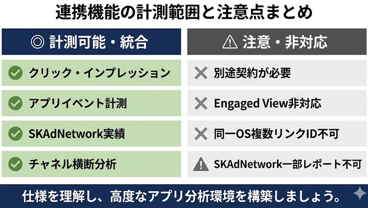 別途契約が必要です 。Engaged View計測には非対応で、同一OSでの複数リンクIDの同時利用もできません 。SKAd Networkの一部実績値はレポートで利用できない点に注意が必要です 。
