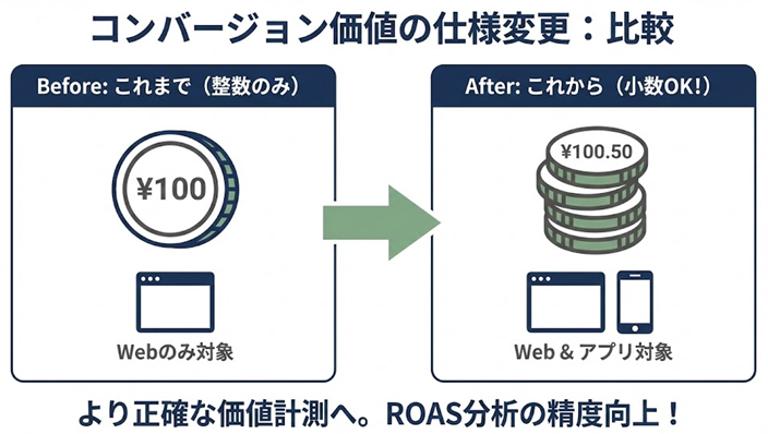 小数点単位での正確な価値計測が可能になり、成果分析の精度が向上します 。アプリ広告でも価値設定ができるため、ウェブと共通の基準で成果を管理しやすくなります 。
